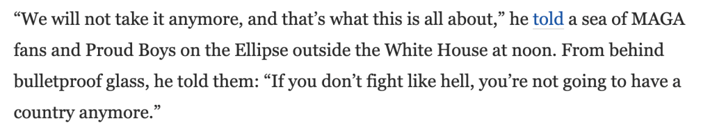 Do you see the double standards here? Trump and many of his supporters have welcomed political violence and threats of violence multiple times, but when political violence is aimed at Trump the demand is not only that his critics should denounce the violence (which, of course, they should) but also denounce factually correct statements that are critical of Trump, such as him being a threat to democracy with his disdain for election results that don’t go his way. And if calls for unity is incompatible with talking about threats to democracy, why don’t Trump’s supporters criticize him when he described the Democrats as a threat to democracy?